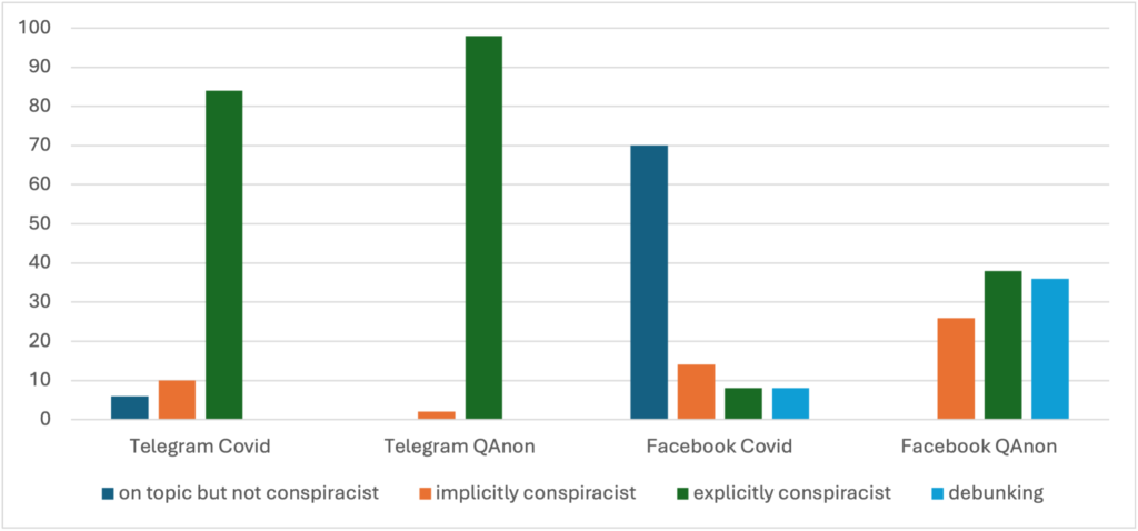 Figure 2.8 Comparison of post type for Covid and QAnon conspiracy theories on Telegram and Facebook in Germany.