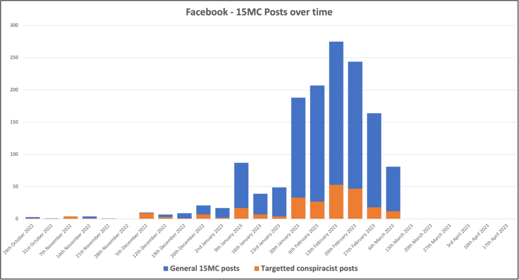 Figure 8.1 A chart showing the number of posts mentioning the term ‘15-minute city’ in both the ‘general’ and ‘targeted’ Facebook datasets, 2022-2023.