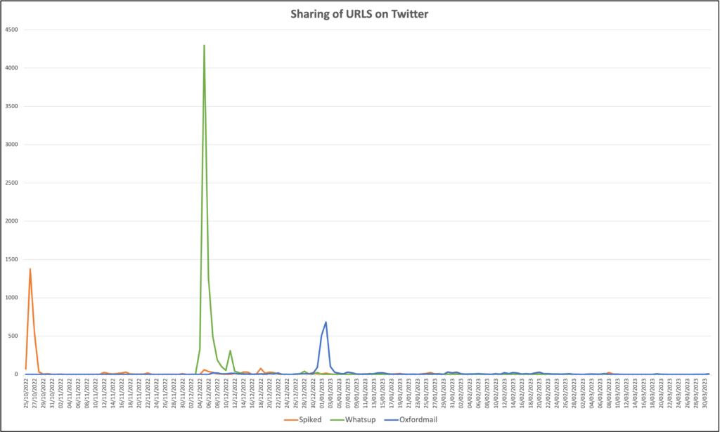 Figure 8.2 A graph showing the number of posts in our dataset linking to the articles on 15-minute cities in Spiked Online, the Oxford Mail and ‘Watts Up With That?’ on Twitter, 2022–2023.
