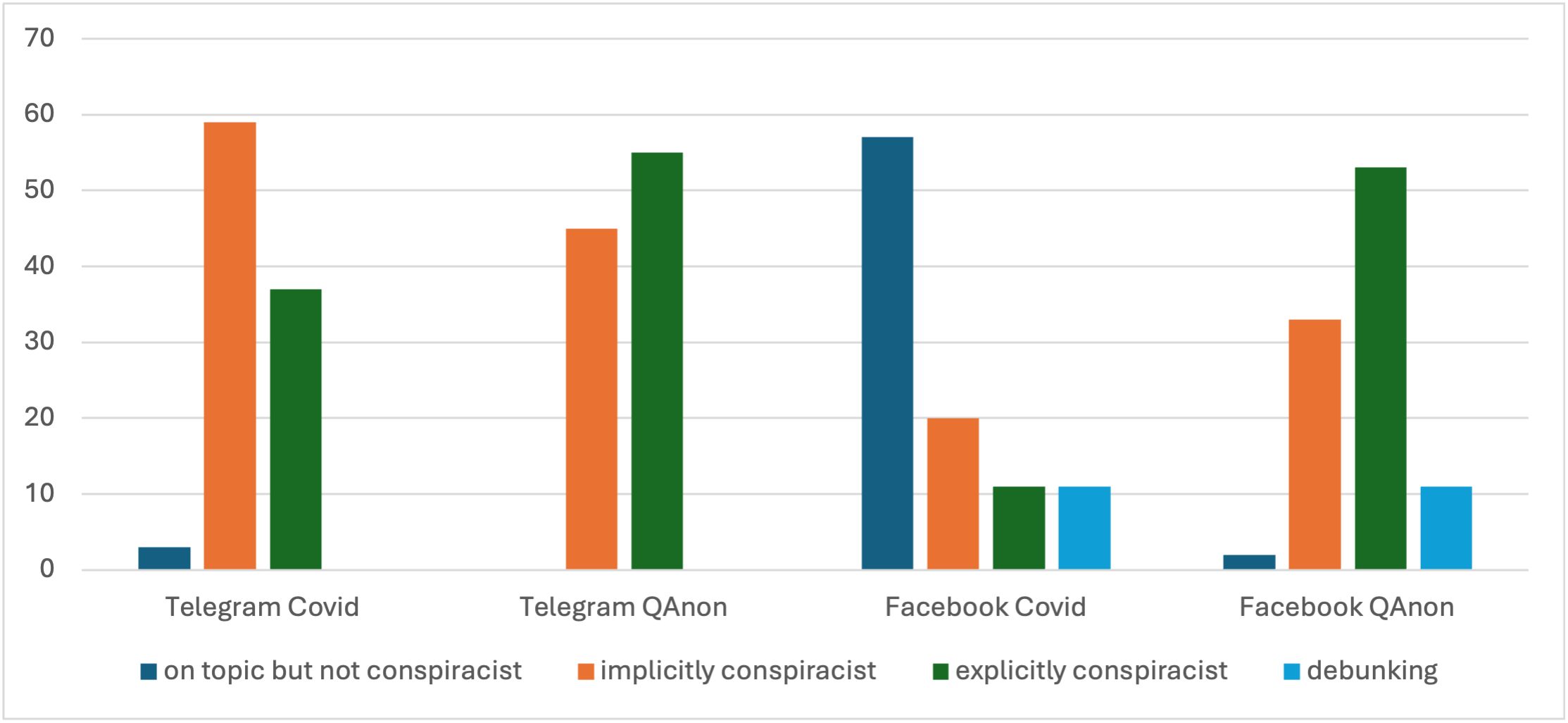 Figure 2.8 Comparison of post type for Covid and QAnon conspiracy theories on Telegram and Facebook in Germany.