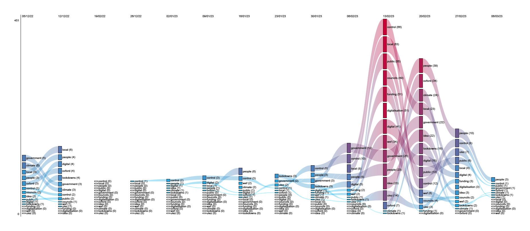 Figure 2.16 Rank-flow diagram showing the changing frequency of the most used words in the UK Telegram dataset for the General topic.
